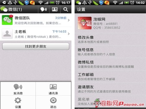 填好名字後,我們就可以點擊進入下一步了,進入微信主頁後,椒友們可以點擊設置進行個人資源設置,可以在相冊裡選擇一張自己喜歡的照片做為頭像,也可以隨地自拍一張,秀出自己的個性。另外,椒友們還可以邀請朋友進入微信,讓你們的溝通更方便。