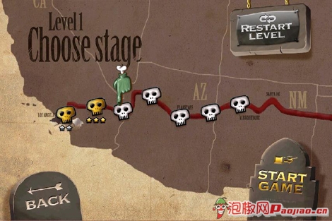 地形在這款僵屍騎士裡是不能夠提供給用戶自由選擇的。必須一步一步來。不要心急嘛,路還長著吶。看到地圖上一條直線上這些密密麻麻的骷髅頭了吧,這就是所謂的關卡啦。每個關卡都會給出對應的表演評定,想高分的話就必須反復嘗試。好事多磨嘛。