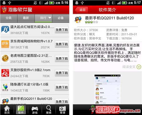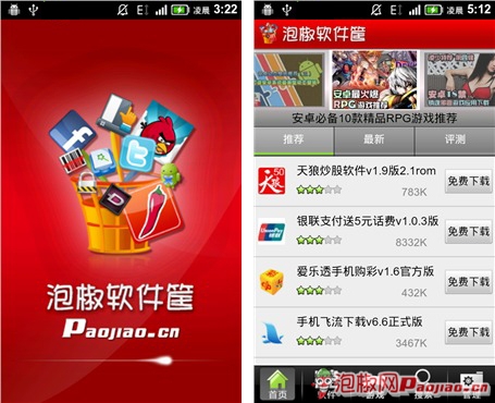 泡椒軟件筐-軟件排行頻道(左)軟件詳細頁(右)