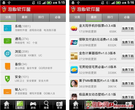 泡椒軟件筐-軟件分類頻道(左)最新軟件頻道(右)
