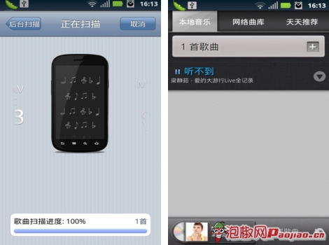 椒友們可以通過泡椒網提供的安卓驅動或是泡椒軟件筐搜索並下載天天動聽到自己的手機之中。點擊安裝完成之後的圖標開始運行軟件,一幅藍底白字的 LOGO很搶眼的引入眼簾,如果沒有掃描添加過歌曲受此進入之後都會提示大家進行掃描添加,這是一個非常人性的設定,用起來會有一種十分溫馨的感覺。