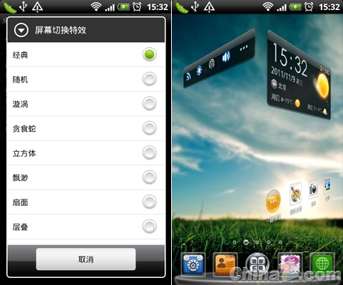 360手機桌面具有多種屏幕切換特效,可選擇有漩渦、貪食蛇、立方體等。