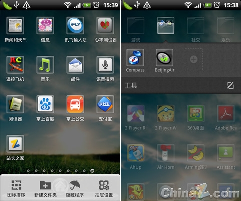應用程序顯示效果,可進行設置文件夾,給應用分類,支持應用排序、隱藏圖標等功能