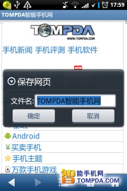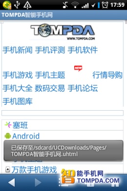 通過點擊菜單中的工具“保存網頁”按鈕,軟件會將網頁自動保存到儲存卡的UCDownload/Pages文件夾中,如果想查看保存過的網頁,可以在菜單界面下選擇“文件管理”按鈕,進入UCDownload/Pages文件夾下,選擇網頁便可以離線浏覽網頁了。