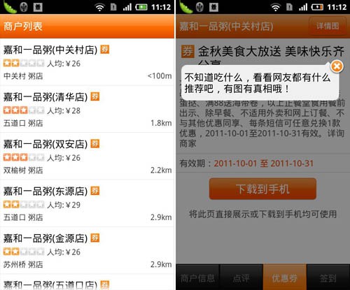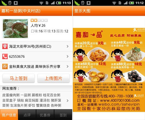 在查看商家信息頁面,系統提供了該店鋪的照片、美食圖片、人均消費、口味、環境、服務、地址、電話和網友推薦等非常詳細的信息,如果該商家提供了相關優惠券服務還會在訂餐電話下方顯示出來,用戶可以將其下載到手機或是直接在用餐時展示即可使用。