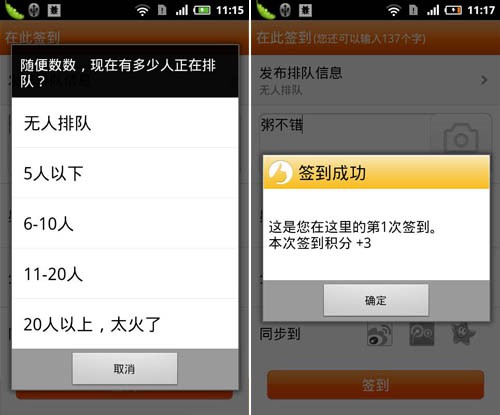簽到的第一項就是發布排隊信息,分別有無人排隊、5人以下、6-10人、11-20人、20人以上太火了,這裡一定要提醒以下廣大用戶,選擇該項時一定不要點錯了或是故意點錯,這樣可能會影響到部分人選擇到此就餐,但也難免哪位用戶一抖手點錯,這也是該項新功能的一個弊端。