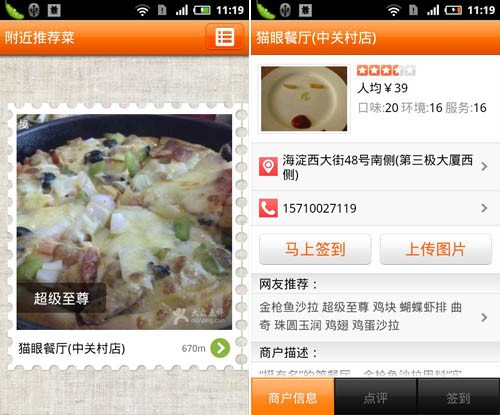大眾點評Android客戶端的最新V4.5版本在保持原有優點上加入了美食商戶簽到增加定位功能、隨時掌握熱門餐廳的排隊狀況、商戶推薦菜增加圖片展示功能、北京、上海、廣州等12個城市推出附近推薦菜、商戶頁增加周邊信息等多項全新舉措,本著盡極大可能的方便用戶為宗旨,在簽到中可以發布排隊狀況,供廣大網友參考,定位功能更是方便了用戶選擇附近的優惠及推薦菜,通過提供的推薦菜圖片憑借著“第一眼的感覺”選擇餐廳,這也算是一種全新的體驗。