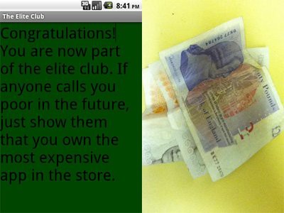 描述:使用這款應用吧,雖然什麼也不能干,卻能證明你鑽石俱樂部的身份,並且告訴所有人:看我,我很有錢。快來買這款最貴的應用吧,理由是:你能。