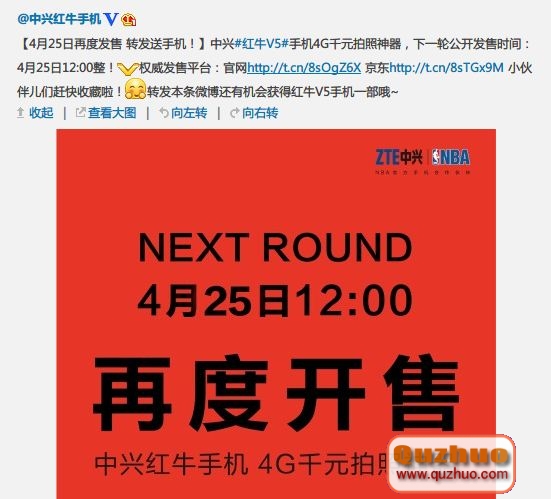 同時,中興紅牛手機於4月25日中午12點在中興紅牛官網與京東商城再次開放購買,1分10秒售罄8萬台手機,熱度依舊驚人。下輪銷售的時間為4月29日中午12點。