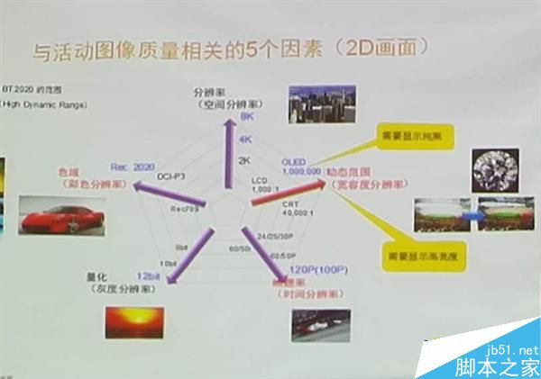 空間分辨率大家都非常的熟悉了,我們不多說。那麼所謂的色彩分辨率是什麼?其實索尼主要指的是色域,因為色域的提升會讓畫面的層次更加豐富。傳統的液晶顯示設備色域不高,不過OLED面板以及激光光源的投影機色域的提升都非常的明顯,可以實現諸如DCI-P3以及更高的BT.2020的色域范圍,從而符合更高的色域標准,滿足多種專業的需求。