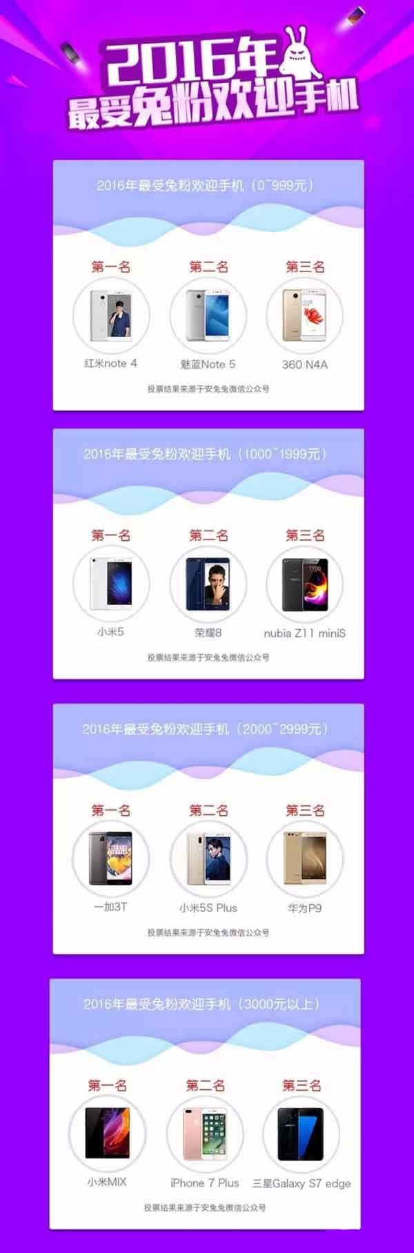 安兔兔最近相繼公布了2016年性能、性價比、好頻率最高的一些熱門手機,而最新的一份榜單很有意思,是基於安兔兔用戶投票調查,選出的不同價位最受歡迎手機。