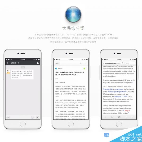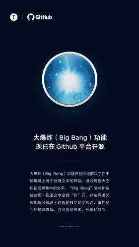 Big Bang則是在用戶使用拇指大面積按壓屏幕中的文字後,將按住的那一段落文字全部“炸”開,按照語義智能拆分成易於選取的獨立的字和詞,可直接搜索、分享和復制,解決了在手機屏幕上難於處理文字的弊端。