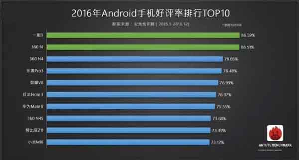 安卓手機只有三款進入TOP10,其中一加3的好評率為86.59%,然後是360 F4、360 N4,好評率分別為86.51%、79.05%。