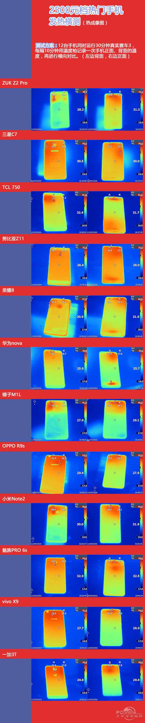 測試方案:12台手機調至中等亮度、中等聲音和連接Wi-Fi清後台的情況下同時運行30分鐘真實賽車3,每隔10分鐘用溫度槍記錄一次手機正面、背面的溫度,再進行橫向對比。