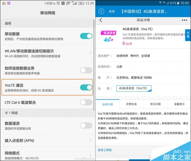 開啟VoLTE的方法很簡單,它大都被手機廠商隱藏在“設置→無線和網絡→移動網絡”中,打開VoLTE通話對應的勾選即可。此外,使用VoLTE技術可能還需要運營商開通這項服務。通過撥打10086或登錄移動手機營業廳客戶端,就能免費開啟VoLTE服務。此後,當我們在使用VoLTE進行通話時,通話界面的時間旁邊會顯示“高清”,頂部的信號欄也會出現一個HD的圖標。