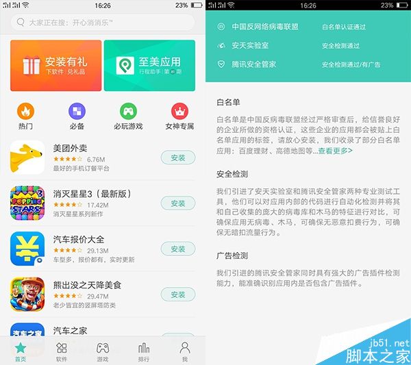 以OPPO R9s的ColorOS3.0應用商店為例,該應用商店引進了安天實驗室和騰訊安全管家兩種專業測試工具,他們可以對應用內部的代碼進行自動化檢測並將其和自己收集的龐大病毒庫和木馬的特征進行對比,可以確保應用無病毒、木馬、可確保無惡意扣費行為,可確保無暗扣流量行為。