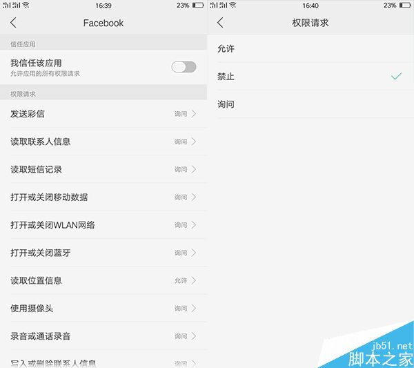 比如可以設置一款應用在訪問手機通訊錄、短信的時候需要用戶允許才能繼續操作,也可以干脆禁止應用訪問敏感權限。不過有一些比較霸道的應用如果禁止敏感權限就無法正常啟動,所以手機隱私控制並不是萬能的,關鍵還是在於應用開發者的自律。