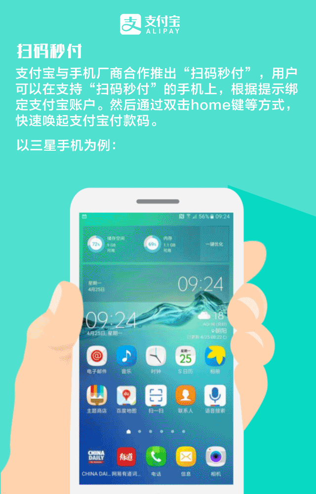 支付寶與手機廠商合作推出了“掃碼秒付”,用戶在支持“掃碼秒付”的手機上,根據提示綁定支付寶帳戶,就能通過雙擊Home鍵等方式,快速喚起支付寶付款碼: