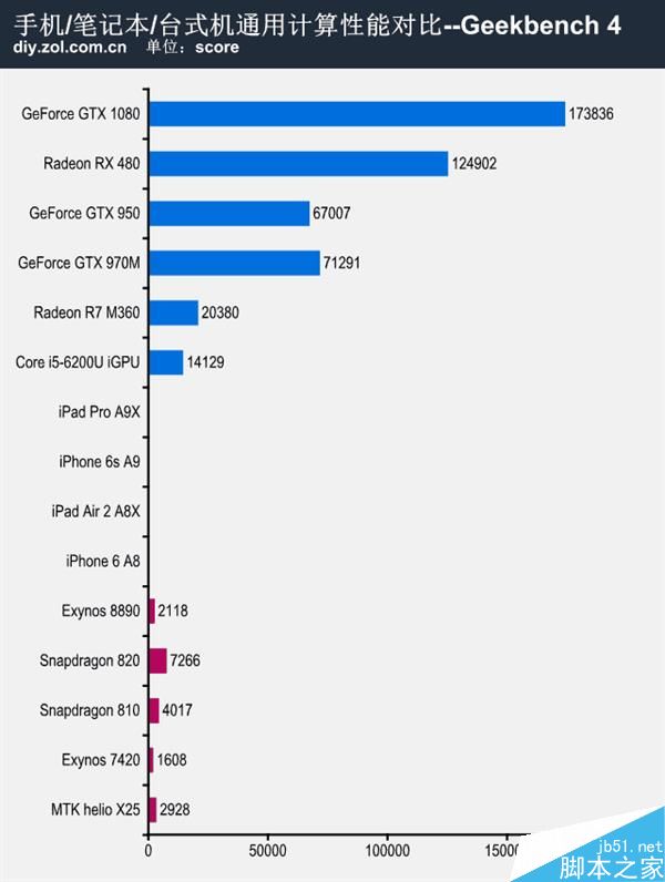 通用計算性能,Geekbench 4主要考量芯片圖形處理單元的Compute計算性能,對於手機芯片而言GPU和CPU單元是整合在一顆Die上,而中高端的筆記本、桌面平台,通常配有獨立顯卡,而這些顯卡肆無忌憚的從電源崛起功耗,自然是手機芯片無法比擬的。