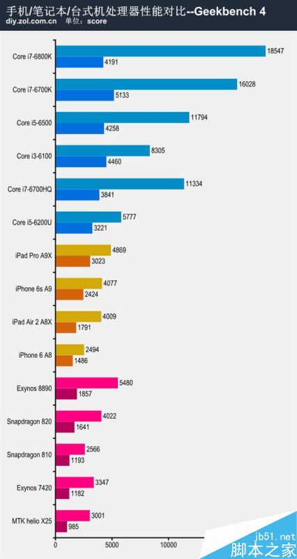 毫無懸念PC處理器以碾壓優勢領先手機處理器,而桌面處理器也普遍高於筆記本處理器,但是細看諸如蘋果的A9X處理器已經完全具備和中低端移動處理器一教高下的實力,無論是單核性能還是多核性能都比較接近Core i5-6200U處理器,畢竟Core i5-6200U處理器TDP高達15W,如果論能效比,Core i5-6200U處理器可能會輸的很慘。