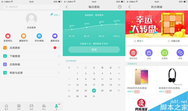 在ColorOS3.0軟件商店中,除了APP安全、豐富易用、提醒應用更新、卸載管理之外,內含的福利可能就是用戶玩機需要注意的了。(登錄OPPO賬號)每天在軟件商店簽到或者安裝、打開指定應用就可以獲得積分,積分除了可以抽獎R9手機等之外,還可以直接換取“小歐公仔”實物、餓了嗎紅包、移動話費等,十分實用。