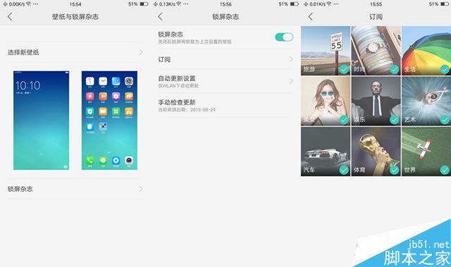 那麼如何設置自己喜歡類型的壁紙呢?只要點擊“設置”—“壁紙與鎖屏雜志”—“鎖屏雜志”,可以管理是否打開鎖屏雜志與鎖屏雜志的不同類型訂閱,讓自己的OPPO R9每次都會看到不一樣的風景。