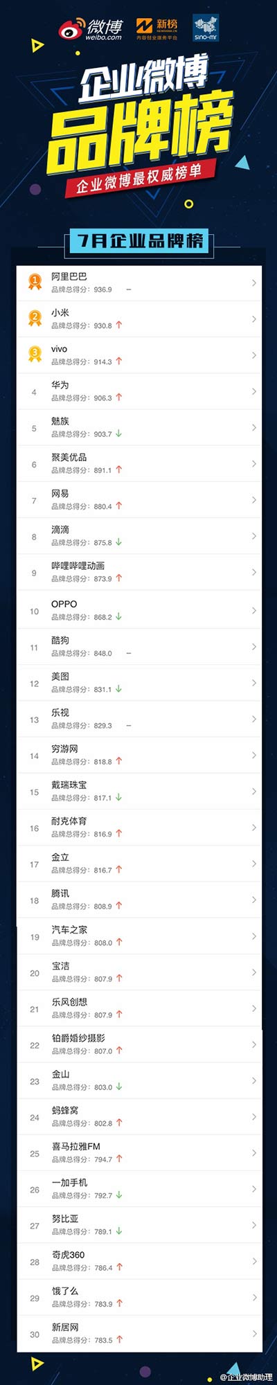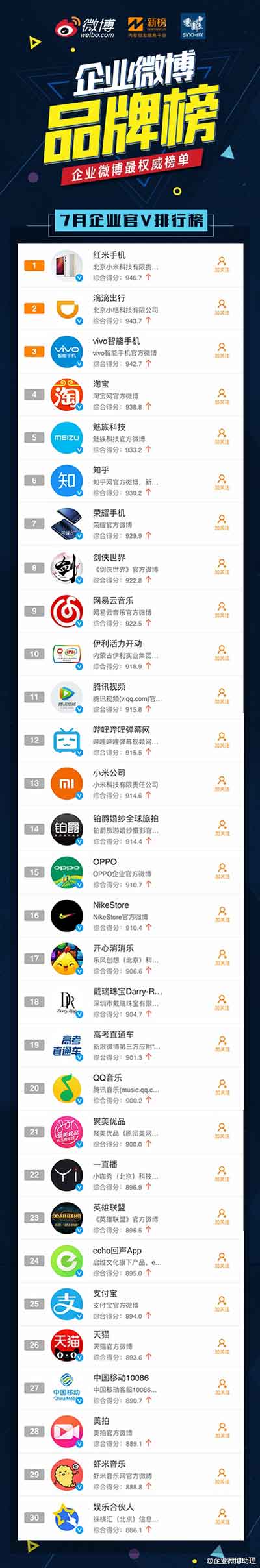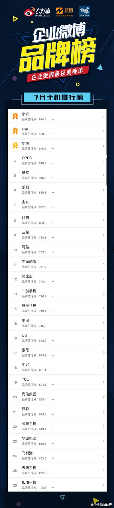 日前,七月份企業微博品牌榜正式發布,其中微博攜手新榜官微以及賽諾中國聯合發布了“手機排行榜”。