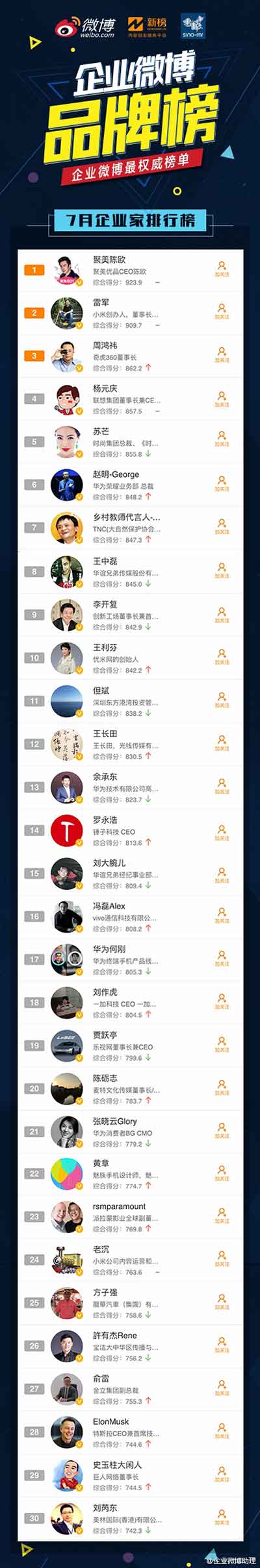 除了手機排名外,還有品牌排名、官V排名、企業家排名,詳情可參見這裡:http://e.weibo.com/v1/eps/entrepreneur/index