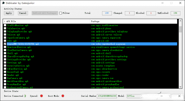用Debloater軟件刪除的APP還可借助該軟件恢復,方法是點擊Read Device packages 獲取設備上安裝的應用列表後,找到刪除的軟件,去掉勾選再點擊Apply按鈕。