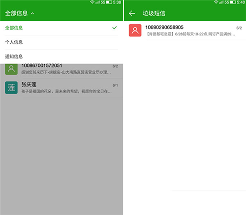 樂視超級手機自帶的短信APP可以自動識別垃圾短信並把垃圾短信放入同一個文件夾,這樣方便我們進行刪除操作。不僅能識別垃圾短信,還會自動為信息歸類到通知信息或個人信息,這樣可以提高我們對短信的快捷刪除操作。