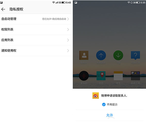 樂視超級手機可以很方便的在隱私授權裡進行各種APP的權限管理,可以很方便的設置APP開機自啟動管理以及某些APP訪問通話記錄、短信內容和權限,這樣可以保證通訊信息的安全,不讓第三訪軟件盜走電話及短信記錄,很多手機的系統裡需要開通ROOT權限並且借助第三方APP來實現。