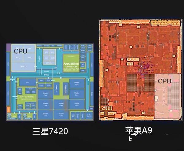 那麼為什麼一些雙核CPU的性能都要比那些所謂8核的CPU要好了。因為CPU運算邏輯部件的面積大小決定了CPU晶體管的數量(下圖白灰色部分)。下圖就是三星獵戶座7420和蘋果A9的大小對比圖,我們不難發現蘋果A9雙核CPU運算邏輯部件的面積比三星8核還大,這就代表這A9的晶體管數量比三星7420要多。正是這樣才使得A9比7420的性能好很多。