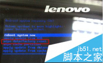3、使用音量+和音量—鍵調整亮條至“wipe data/factory reset”即“清除數據恢復工廠設置”,按電源鍵確認;