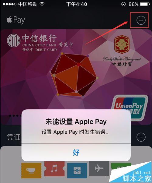 首先,打開Wallet;然後可以看到已經有Apple Pay的界面,點擊右上角的“+”按鈕添加,出現“未能設置Apple Pay”的錯誤。