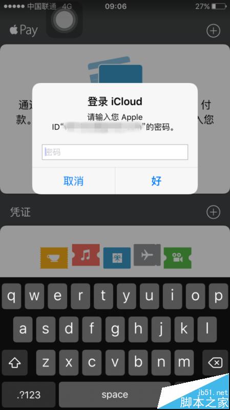4、點擊右上角的+符號增加銀行卡,首先需要輸入手機APPLE ID的密碼,輸入後選擇右上角的下一步,就會進入到輸入銀行卡片信息的窗口,可以是借記卡也可以是信用卡。