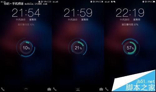 (圖1為OPPO R7s充電效果圖,圖2為VOOC閃充與普通充電效果比對圖,圖3為VIVO X6充電效果圖,圖4為VIVO X6雙引擎閃充效果圖)