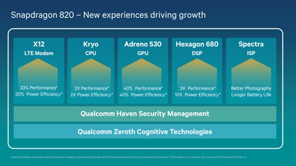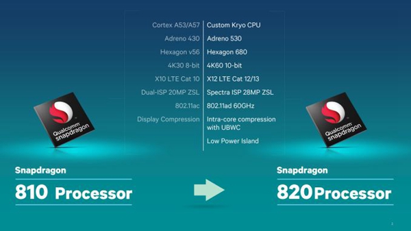 一個月前,高通正式發布了新旗艦處理器骁龍820,規格看上去無比強大:14nm FinFET工藝、自主架構64位CPU Kryo、自主架構GPU Adreno 530、Hexagon 680 DSP處理器、雙ISP處理器和2800萬像素攝像頭、LPDDR4雙通道內存、UFS 2.0存儲、802.11ad無線網絡、X12/13 600Mbps整合基帶、Quick Charge 3.0快速充電……