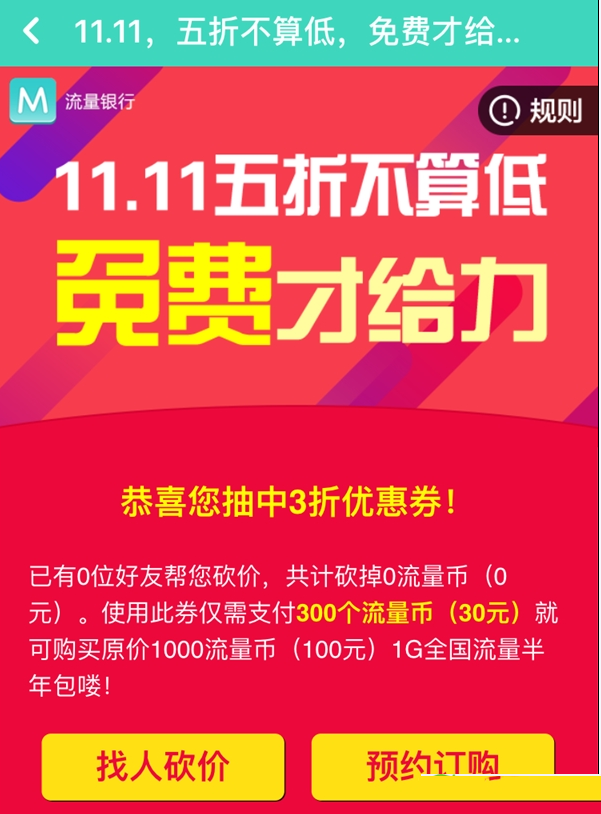比如你抽到一個3折優惠券,那麼10人幫你砍價後,就可以20元購買1GB流量半年包;如果你抽到一個1折優惠券,那麼10人幫你砍價後,就可以0元購買1GB流量半年包。
