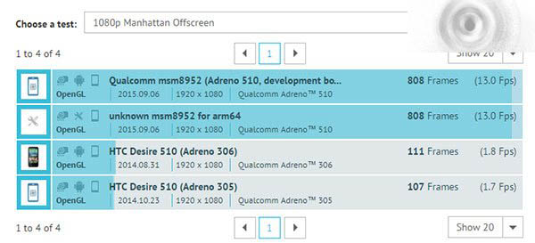 網站數據顯示,Adreno 510在1080p分辨率下曼哈頓場景達到了13.0FPS,T-Rex場景下也達到了31.2FPS,而骁龍615 Adreno 405兩項的成績只有6FPS、15.3FPS,數據對比,高下立判。