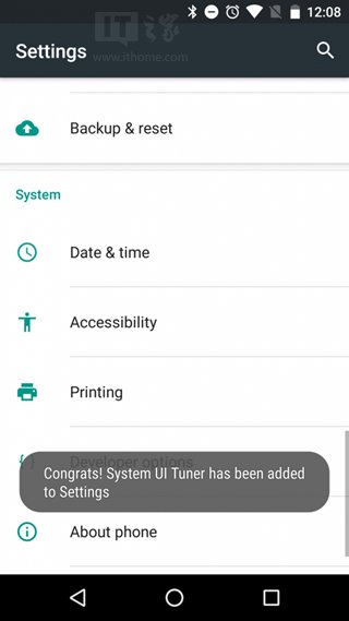 在安卓M開發者預覽版3中,我們發現,這項功能開關從原來的“開發者選項”中被移除,要想啟動System UI Tuner,只需要長按下拉快捷工具欄中的“設置”齒輪圖標即可,此時,設置圖標右側也會出現一個較小的扳手圖標。之後,你就可以點擊進入系統設置中,滑動到頁面底部,即可發現System UI Tuner菜單。