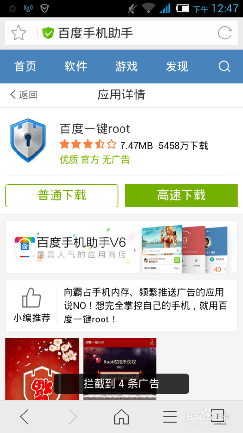 很多手機預裝軟件都卸載不了,廣告煩人,只需要root,就可以任意的刪掉手機軟件了。小編介紹如何獲取root權限。方法/步驟1、在浏覽器搜索百度一鍵root,普通下載。等待