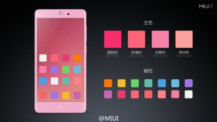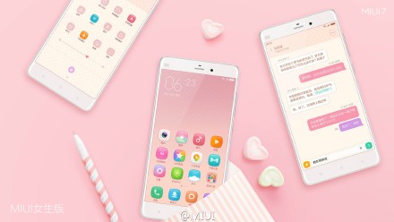此次MIUI 7為小米手機用戶帶來了5套系統UI,以及15790套個性主題,8月13日-8月16日期間,所有MIUI主題免費3天。女神版,選取2016春夏流行的粉色,從中挑選出胭脂粉、玫瑰粉、初櫻粉、裸妝粉四種主色,配合色彩體系設計圖標,參考奢侈品設計元素,和小米Note女神版相得益彰。除此之外,還有女生版、男生版、輕奢版,總能找到屬於你的獨一無二!