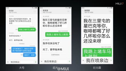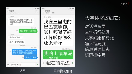 如今很多手機中都有搭載大字體模式,但是小米的MIUI 7不是簡單的把字體變大,而是在行間距等方面做了調整,同樣的屏幕,小米的巨無霸大字體顯示內容更多。