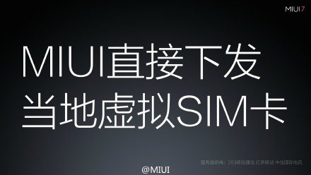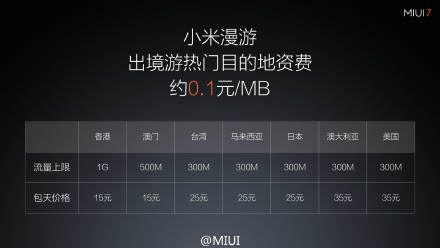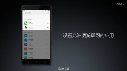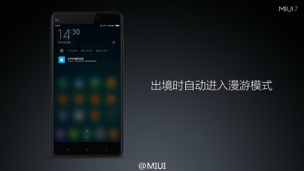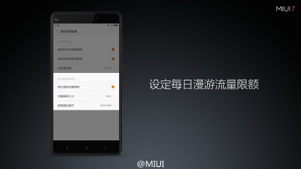 針對差旅人士境外的漫游費困擾,MIUI 7設置了漫游模式,出境時自動進入這一模式,可以對應用進行設置是否可以使用流量,並可以設定每天所使用的流量額度。MIUI 7可以提供當地的虛擬SIM卡,讓用戶用更經濟的資費上網。