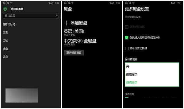 微軟的Win10手機版上的光標控制器是可以設置分為左邊、右邊的,甚至可以取消。