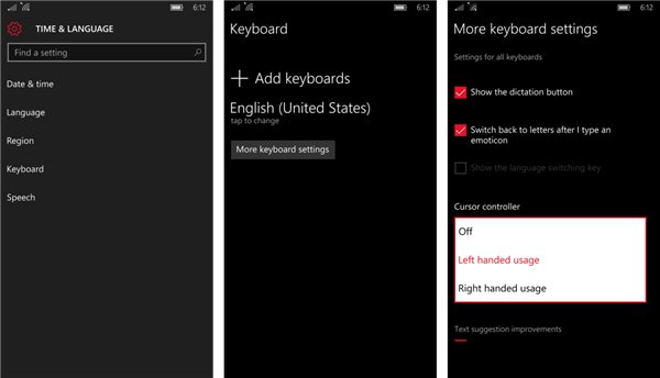 Win10Mobile上的鍵盤相比WP8.1有了很大改進,並且人性化地加入了鍵盤光標控制器,允許用戶按住中間的小圓點上下左右移動光標位置。不過有時候你需要光標控制在左邊,有時候習慣右邊怎麼辦?下面本站小編就為大家帶來了Win10 Mobile系統鍵盤調整光標控制器設置教程,一起來看看吧!