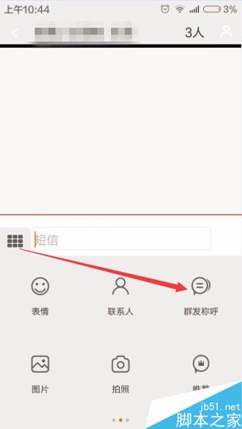 3、發短信咱們得有對象是吧,我們要先把祝福對象給選好了,自打MIUI更新之後,就覺得不是很好用了。看到箭頭所指的小人按鈕,點擊它來增加對象吧。