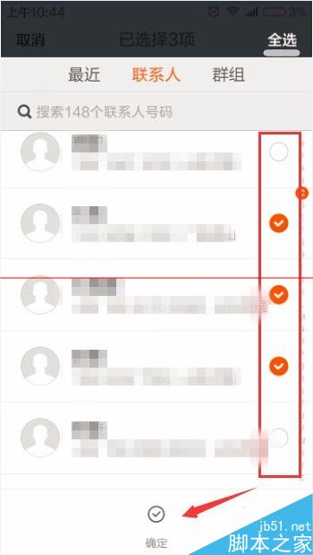 4、我們可以點擊右上角的全選按鈕,將我們通訊錄的所有人都選中。當然我們也可以自己選擇,點擊每個人後面的白色圈圈,選中的人員就會在白色圈圈中出現一個對號。然後點擊確定。