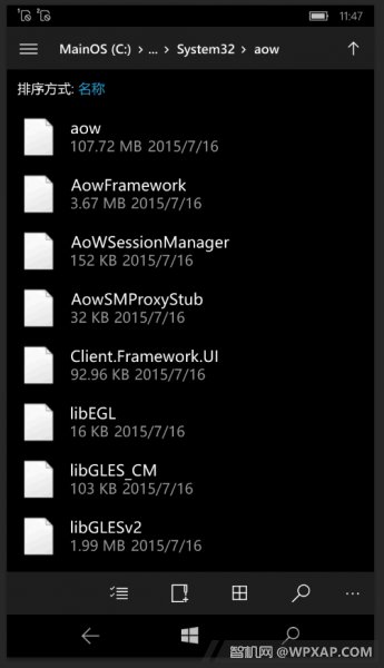 開發者reker表示,在手機C:\windows\system32\aow文件夾中,可以看到aow組件,其中包括AoW會話管理器、Linux的OpenGLES兼容庫以及一個aow.wim鏡像。將aow.wim鏡像解包後,可以看到幾乎完整的Android 4.4.4鏡像,包含大多數Android核心文件。