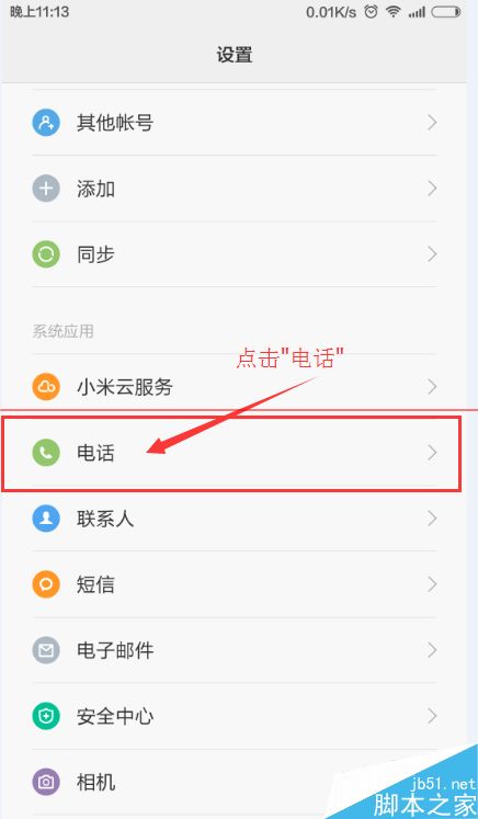 2、點擊設置裡面的“電話”
